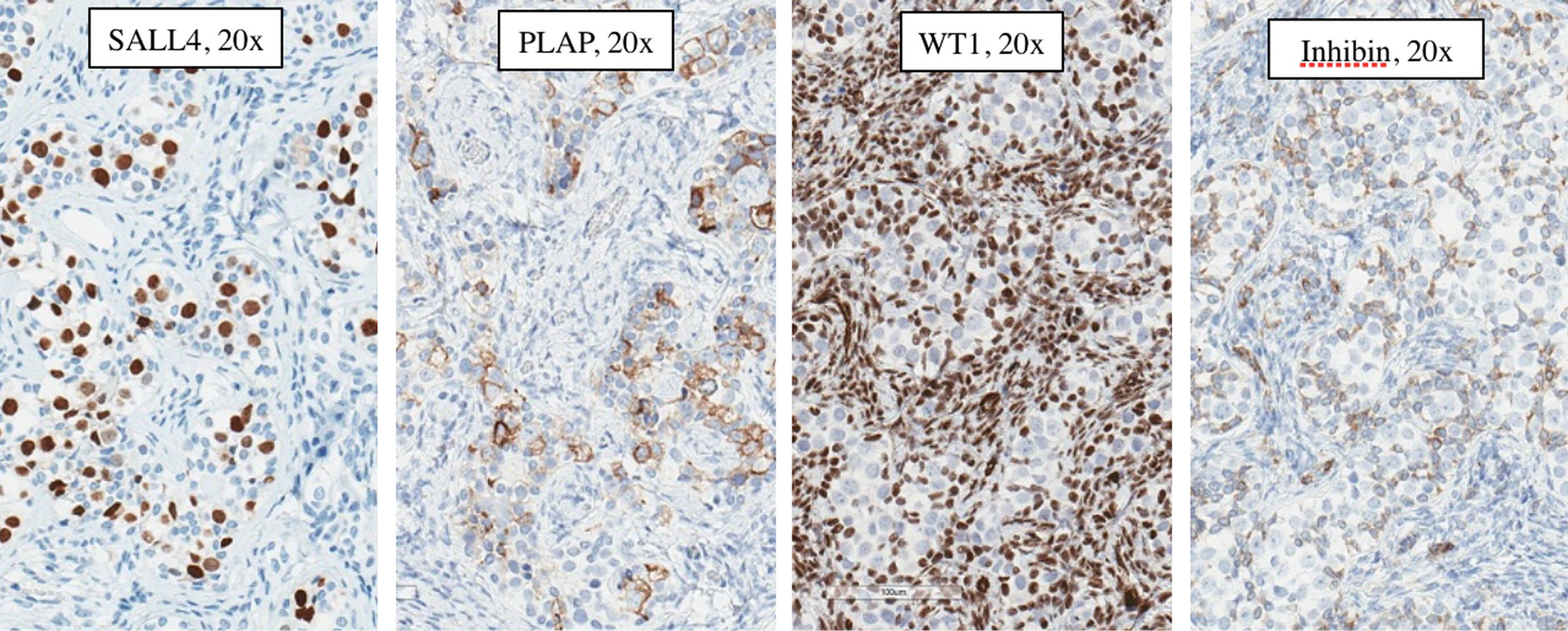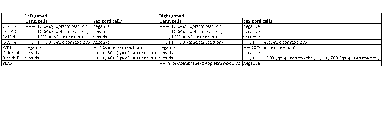 Right gonad gonadoblastoma immunohistochemistry: Germ cells: SALL4 (Spalt-like transcription factor 4) – positive, PLAP (placental-like alkaline phosphatase) – positive, WT1 (Wilms tumor 1) – negative, Inhibin – negative; Sex cord cells: SALL4 (Spalt-like transcription factor 4) – negative, PLAP (placental-like alkaline phosphatase) – negative, WT1 (Wilms tumor 1) – positive, Inhibin – positive.