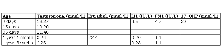 The index patient was born with ambiguous genitalia. Clinical examination revealed posterior penoscrotal hypospadia, unpalpable gonads and bilateral inguinal hernias. Transabdominal ultrasound (US) examination revealed 2.81 cm length uterus: 1.07 cm cervix, 1.74 cm fundus and 3.0 × 1.94 cm vagina. Cardiac US revealed atrial septal defect and bicuspid aortic valve. Abdomen and pelvic magnetic resonance imaging showed normal size horseshoe kidney, anteversion of uterus, minimal hydrocolpos: dilated vagina to 1.4 cm and persistent urogenital sinus. Moreover, on the left near the uterus, a 1.0 × 0,5 cm structure was seen that resembled an ovary. On the right near the bladder a 2.0 × 0.7 cm cystic structure was visualized that connected to the uterus like a fallopian tube. Serum hormone levels presented in Table 1. Testosterone levels after birth and at the beginning of “mini puberty” (36 days) are clearly above the normal female range, but within the typical male range, reflecting normal Leydig cell function from testicular tissue. Normal gonadotropin levels suggest normal gonadal endocrine function of testicular and ovarian tissues, as confirmed later after bilateral gonadectomy. Normal or slightly elevated serum 17-hydroxyprogesterone level at birth ruled out classical congenital adrenal hyperplasia (CAH) due to 21 hydroxylase deficiency, which is considered to be the most common cause of disorders of sex development (DSD) requiring immediate therapy, because karyotype result usually comes later. According to multidisciplinary decision together with the parents, female sex of rearing was chosen.