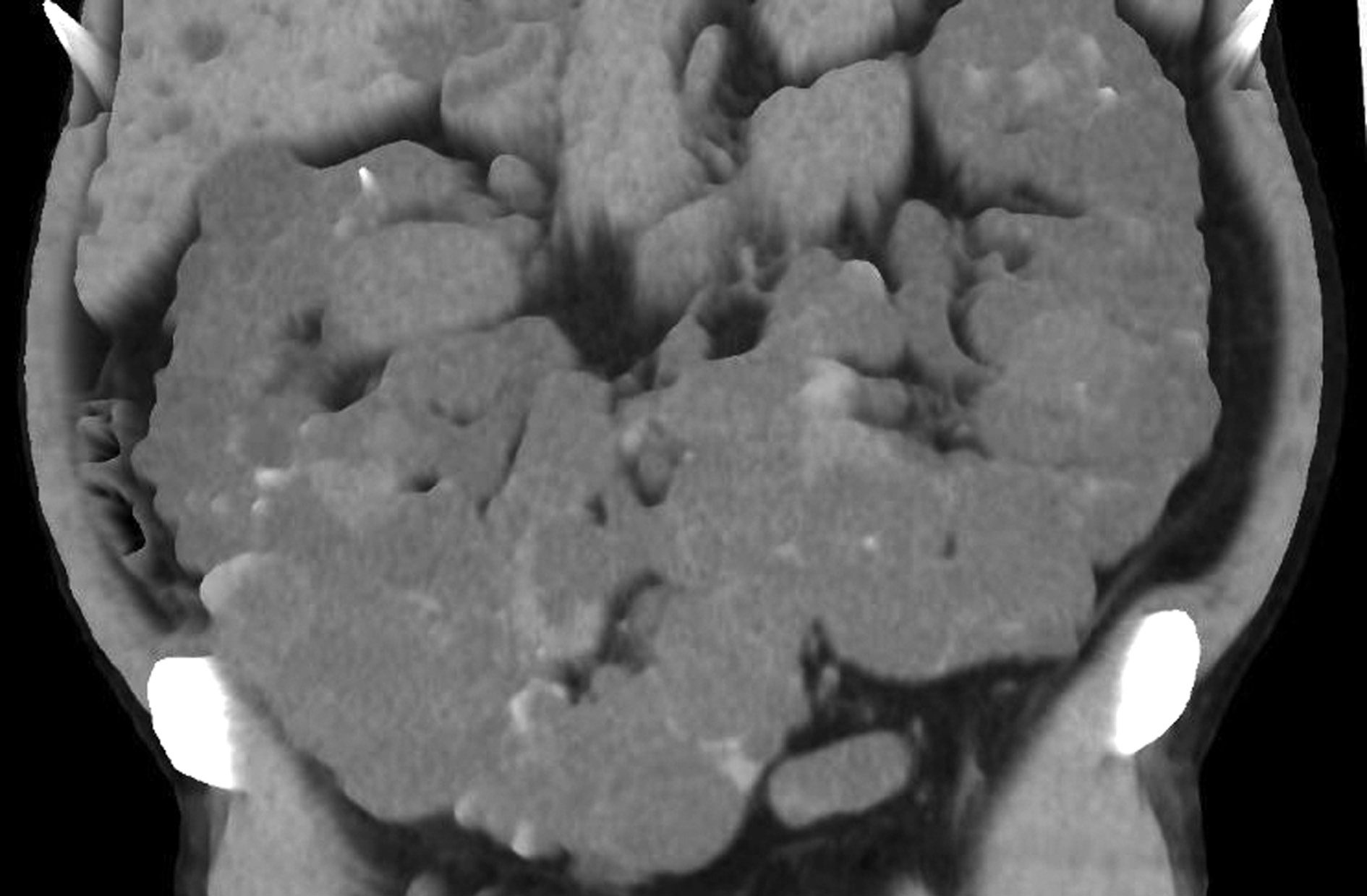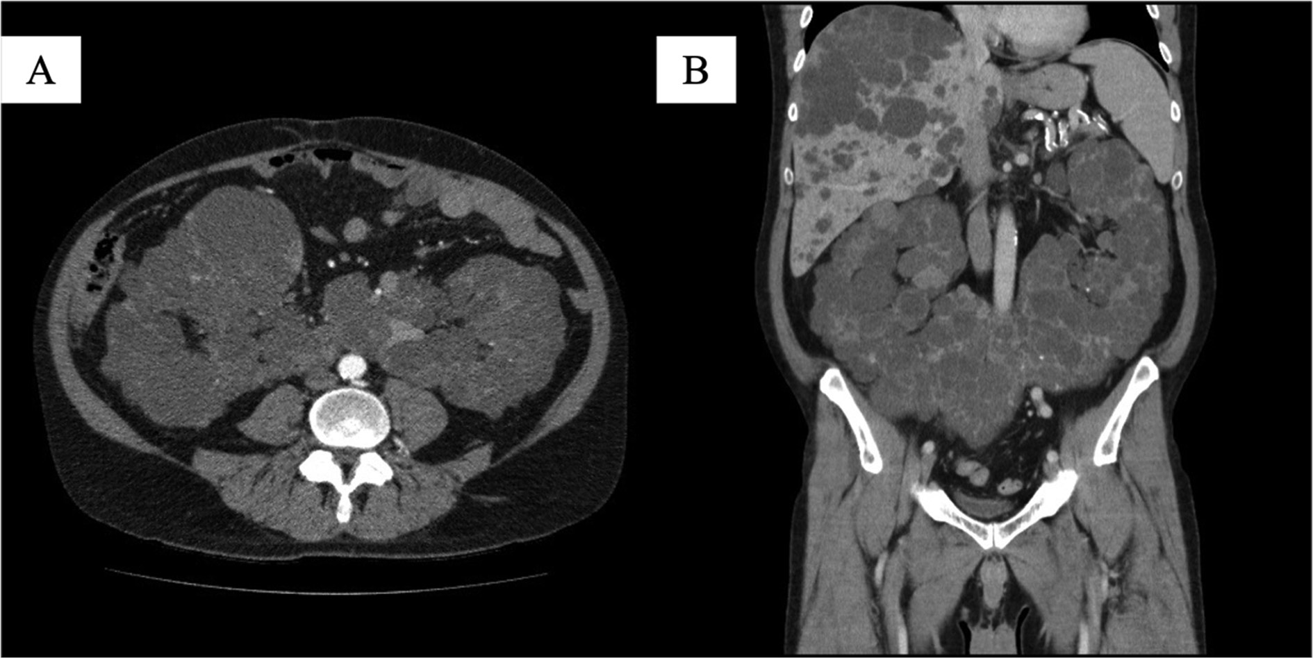 A 49-year-old male patient was admitted to our department for elective bilateral kidney nephrectomy due to ADPKD alongside a horseshoe kidney. The initial diagnosis took place 35 years ago when the patient underwent a random radiological examination with abdominal ultrasound (US). At that time, the patient was asymptomatic, and it was suggested that he change his lifestyle habits (diet, intense physical exercise). Eight years later, the patient referred to symptoms such as pain, breathing problems, hematuria, urinary tract infections, and meteorism of the abdomen. A follow-up US demonstrated nephrolithiasis. In addition, he developed hypertension, which was controlled with medication, and 6 years later, started hemodialysis because of renal failure. From that point on, the symptoms were getting worse, and last year, it was proposed to perform a new radiological examination. Computed tomography (CT) confirmed the existence of a polycystic horseshoe kidney and its progression through the years and demonstrated a challenging altered anatomy .Figures 1, 2 and 3). It was decided to perform a surgical excision.