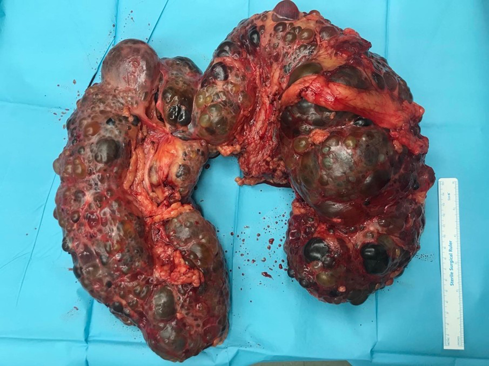 During embryogenesis, several mutations or false expressions of the genes can cause a variety of diseases that lead to surgical conditions. Horseshoe kidney is a common congenital anatomic malformation in which, mainly, the lower poles of both kidneys are fused in a thick tissue called an isthmus. Polycystic kidney disease (PKD) is a less common hereditary autosomal disease caused by mutations in the PKD1 (85%) or PKD2 (15%) genes. Consequently, end-stage renal failure is, in most cases, inevitable [1]. The prevalence of gene mutations in PKD1 is approximately 1 in 474 and varies between 1 in 400 and 1 in 4000 in PKD2 [1, 2].Thus, polycystic horseshoe kidney is a very rare disease, that has been described in less than 30 reports in the global literature, with a prevalence of 1 in 134,000 to 1 in 8,000,000 [3]. To date, there is no report that genetically correlates the two diseases. Indications for surgical intervention include making space within the iliac fossa for renal transplantation, proteinuria, infection, symptoms from mass effect, urolithiasis, or tumors [4]. As far as surgical intervention is concerned, both laparoscopic and open techniques have been described without clear benefit of one over the other, due to the extremely rare incidence. Indeed, laparoscopic nephrectomy is technically challenging due to the renal size. However, it is not technically possible to perform laparoscopic bilateral nephrectomy without dividing the isthmus. By doing so, severe bleeding, cystic rupture, and abscesses can be caused.