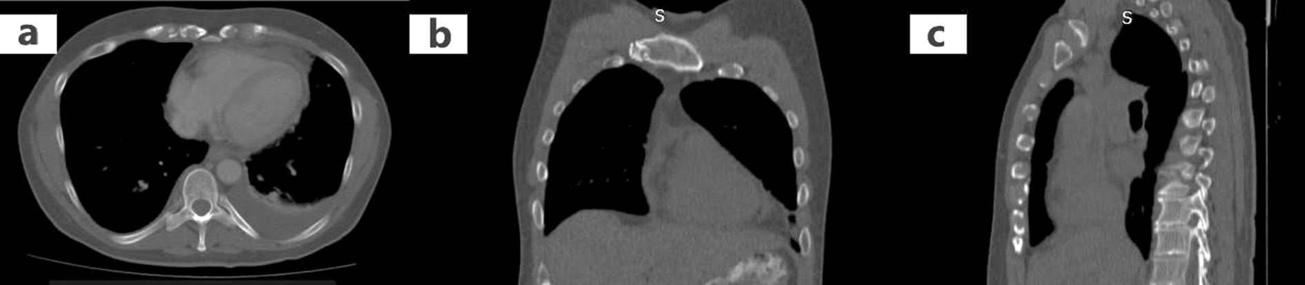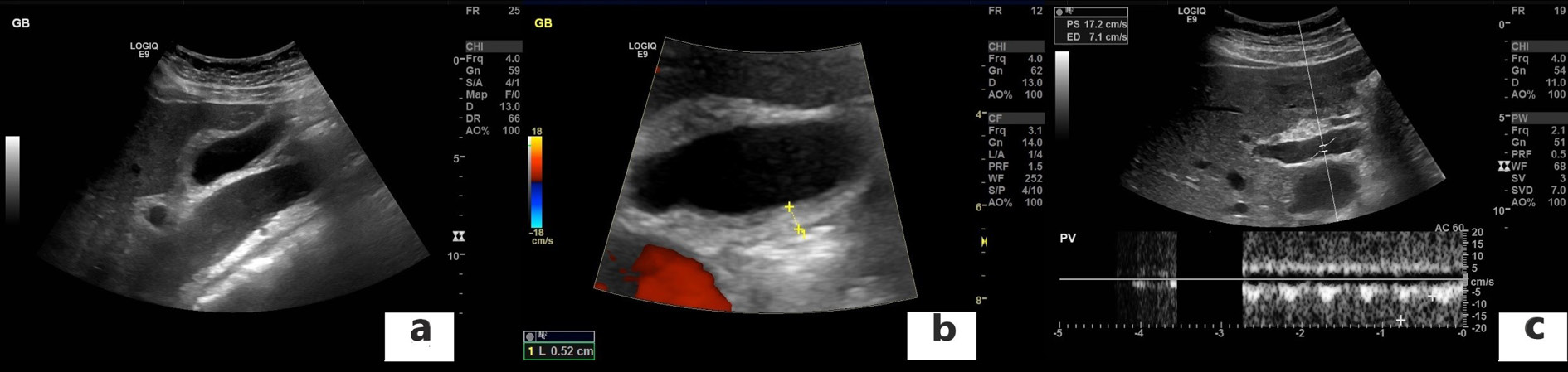 Further imaging evaluation with abdominal (Figure 5) and chest CT (Figure 6a-c) was performed, which showed additionally to pericardial effusion a small left pleural effusion. Finally, a pericardial catheter under ultrasound guidance was inserted, due to high risk of cardiac tamponade. Additionally, diuretics and NSAIDs were administered. The pericardial fluid was transudative and both the bacterial staining and cultures were negative. Testing for ANA and RF, and diagnostic virology tests were negative. After 20 days, both the gallbladder edema and the pericardial effusion had vanished, the liver function returned to normal, and the patient presented no symptoms.