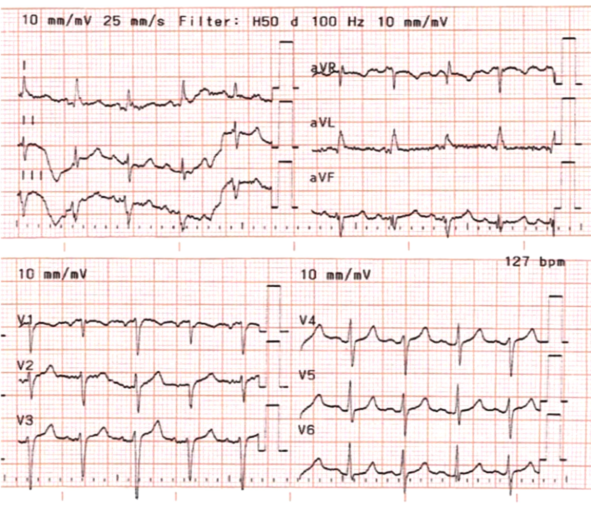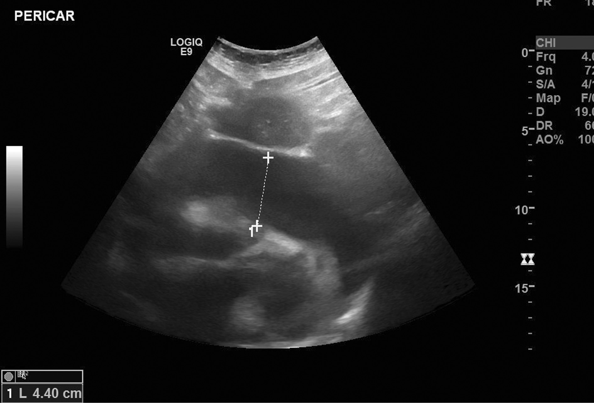 (Figure 2a, b). Color Doppler sonography demonstrated also reduced blood flow to the inferior vena cava (Figure 2c). Therefore, a TTE was performed which revealed a large circumferential pericardial effusion creating an echo-free space of 4.6 cm and a swinging heart (Figure 3). No signs of diminished cardiac wall motion or valvular dysfunction was noticed. Only early mild right ventricular wall diastolic collapse with slightly increased respiratory variation in transvalvular flow velocities were observed while the ejection fraction was 60%. An electrocardiogram was performed afterwards, which showed sinus rhythm and diffuse ST segment elevation compatible with acute pericarditis (Figure 4). More blood tests were conducted, which revealed that the creatine phosphokinase (CPK) level was elevated (240 IU/L) (normal 22-198 IU/L) while troponin test was negative. The B-type natriuretic peptide was normal. Subsequently, these findings were consistent with acute pericarditis and the gallbladder edema was a result of venous congestion due to starting right cardiac failure.