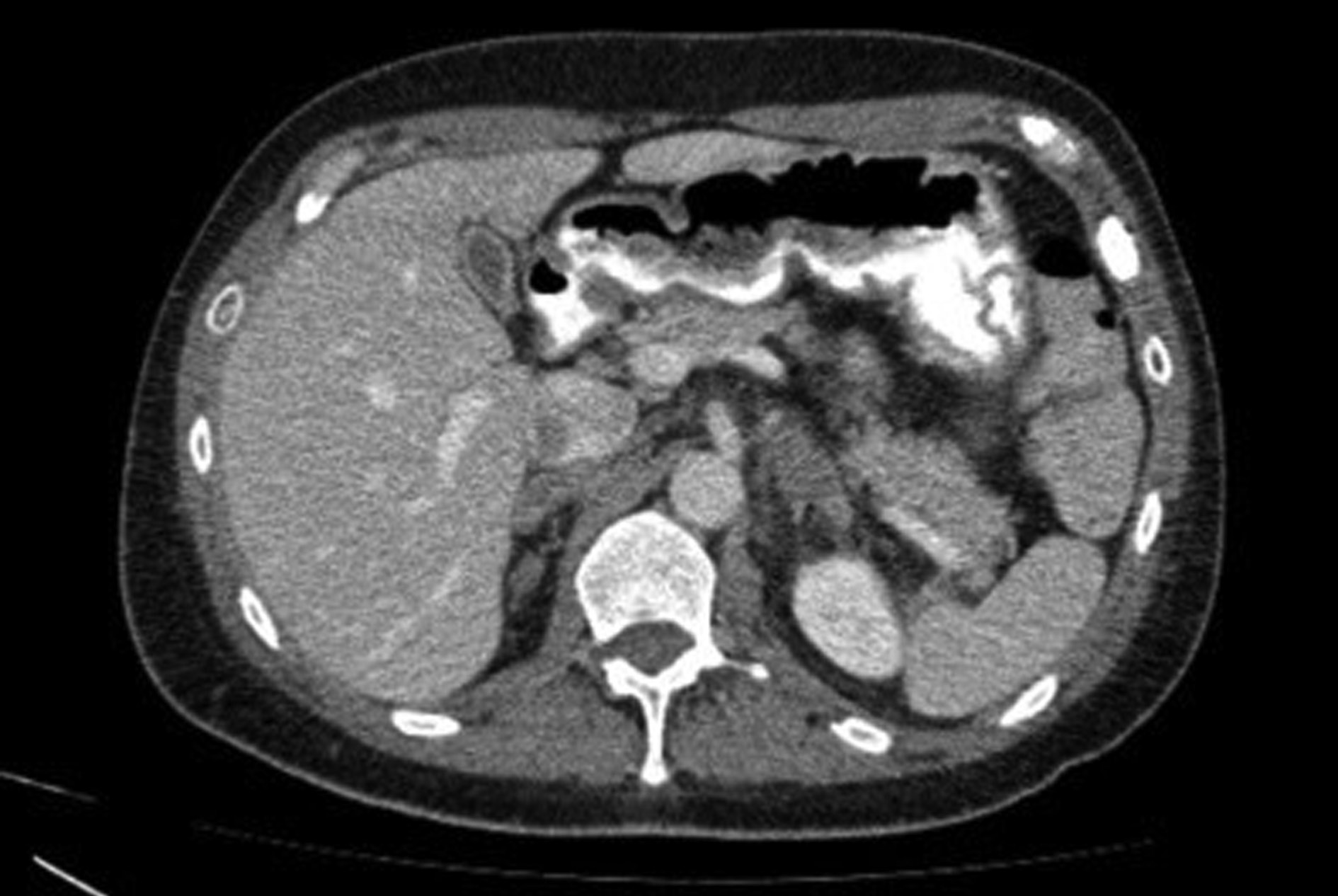 A complete blood count demonstrated WBC 11700/μL (normal 4000–11000/μL) with 68.7% neutrophils. The biochemistry tests showed a CRP of 8.6 mg/dL (normal <0.5mg/dL), aspartate transaminase (AST) 99 IU/L (normal 14–20 IU/L), alanine transaminase (ALT) 152 IU/L (normal 10–40 IU/L), gamma-glutamyl transpeptidase (GGT) 275 IU/L (normal 0–70 IU/L) and total bilirubin 0.76 mg/dL (normal 0.2–0.8mg/dL). Two blood cultures were obtained which proved sterile.