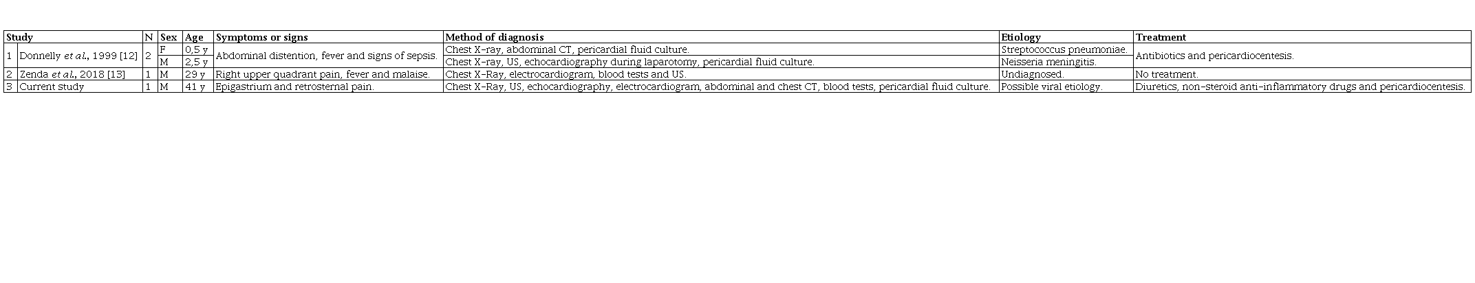 Summary: Ūminis perikarditas yra dažniausias uždegiminis širdiplėvės sutrikimas, nustatomas maždaug 5 proc. atvejų, pacientams patekus į skubios pagalbos skyrių, kai jaučiamas krūtinės skausmas, tačiau nenustatoma miokardo infarkto. Pateikiame 41 metų vyro, atvežto į mūsų ligoninę, atvejį. Jis skundėsi retrosterniniu ir epigastriniu skausmu. Perstemplinės echokardiografijos tyrimas atskleidė perikardo efuziją, o elektrokardiograma ir laboratoriniai tyrimai rodė esant ūminį perikarditą. Abdominaliniu ultragarso tyrimu nustatyta tulžies pūslės edema. Perikardo efuzija buvo gydoma į perikardo ertmę įkišus kateterį, diuretikais ir nesteroidiniais vaistais nuo uždegimo. Šis atvejis atskleidžia, kad ūminis perikarditas gali kliniškai reikštis įvairiais būdais, vienas iš kurių yra tulžies pūslės edema. Be to, kartu su šia konkretaus atvejo analize pristatome visus atvejus, kai vienu metu pasireiškė ir perikarditas, ir cholecistitas arba tulžies pūslės edema.