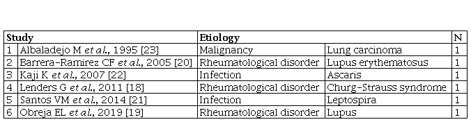 diseases include rheumatological disorders such as lupus erythematosus or Churg–Strauss syndrome [18-20]. In addition, bacterial or parasitic infections, such as Leptospira or Ascaris, are reported in the literature [21, 22]. A case of pulmonary carcinoma, with simultaneous appearance of acalculous cholecystitis and cardiac tamponade, is also reported in the literature [23].