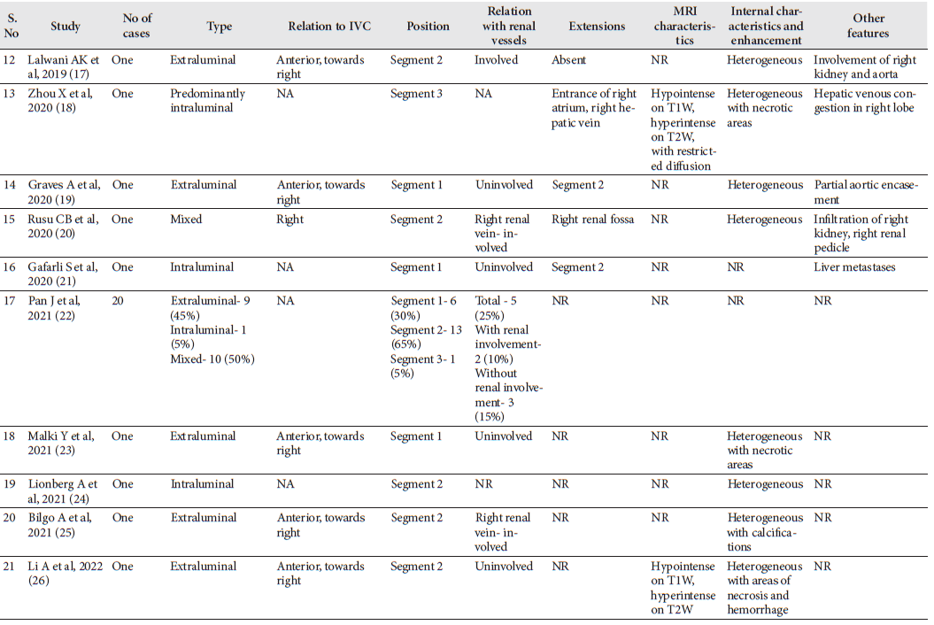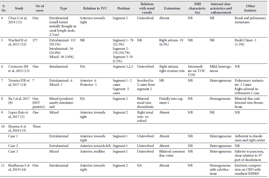 Conclusions: Leiomyosarcoma of the inferior vena cava is a rare tumor of vascular origin. Imaging plays an imperative role in the diagnosis and preoperative evaluation. This article also provides a comprehensive literature review of the radiological features of inferior vena caval leiomyosarcoma that would aid in optimal preoperative characterization and evaluation.
