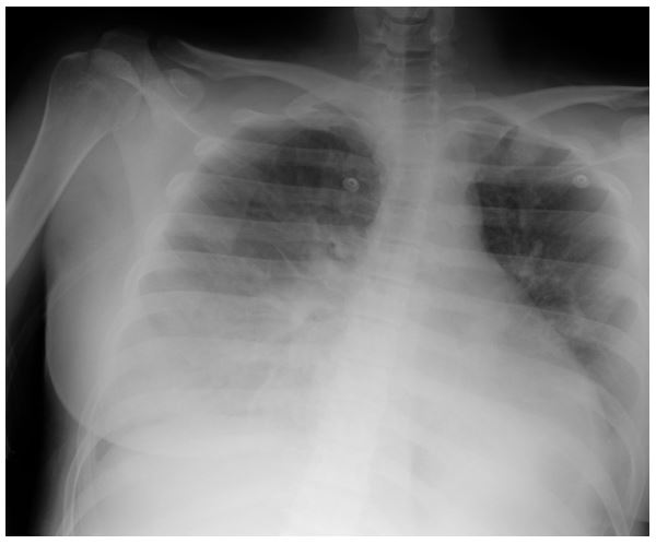 The patient’s chest X-ray demonstrated bilateral pleural effusion as well as consolidation in both lobes.