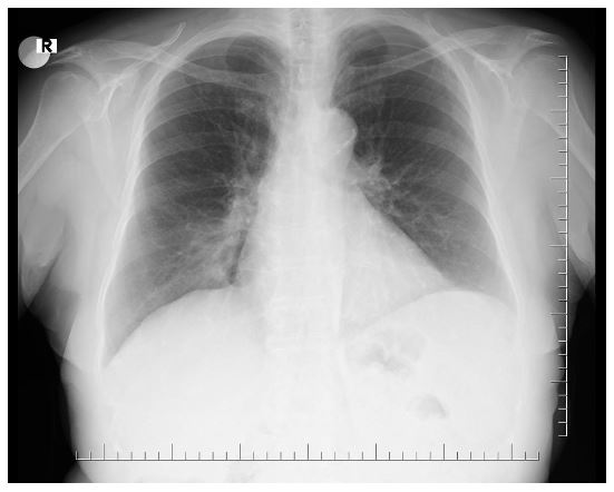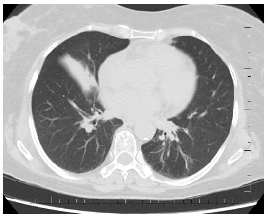 A 67-year-old woman presented with 2 years of productive cough and breathlessness. The patient was farmer, never smoked but had indoor cooking/heating smoke exposure history. She was treated with antibiotics and bronchodilators by her primary care physician but did not improve her symptoms. Lung auscultation and cardiac evaluation was unremarkable. Forced vital capacity (FVC),2.42 L (108%); forced expiratory volume in 1 sec (FEV1), 1.69 L (92%); FEV1/FVC ratio 70% in spirometry. Chest radiograph revealed paracardiac opacity in the right lower zone (Figure 1).