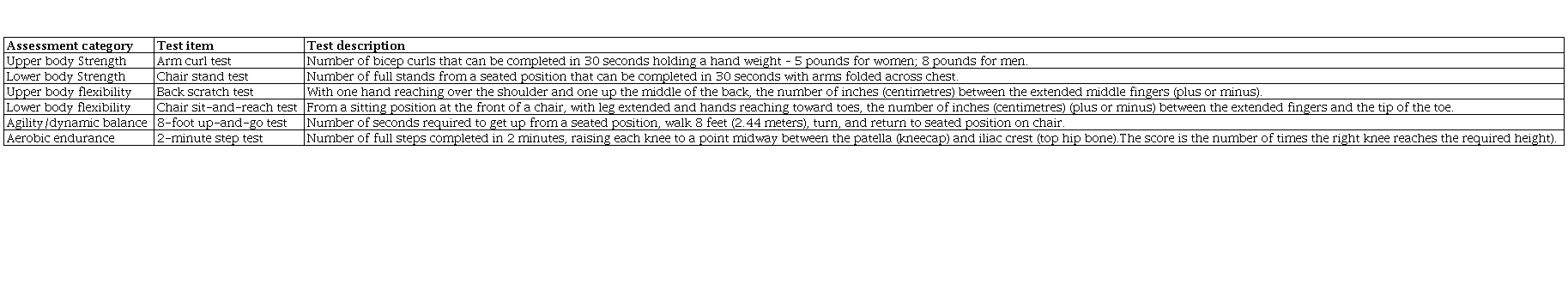 Rikli RE, Jones CJ.Development and Validation of Criterion-Referenced Clinically Relevant Fitness Standards for Maintaining Physical Independence in Later Years.Gerontologist. 2013;53(2):255–267.