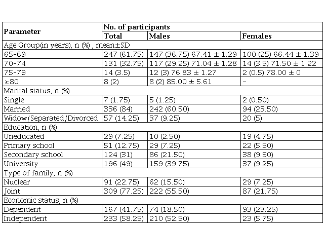 A total of 400 elderly participants comprising 284 men and 116 women with a mean age of 69.80±3.82 years and 67.25±2.57 years, respectively, were assessed for physical fitness tests and perceived wellness. The maximum number of subjects was in the age group of 65−69 years. Based on marital status, 84%were married. Almost half (49%) of participants completed university degree and only 7.25 percent were uneducated. Most of the participants (55.50% males and 21.75% females) stayed in joint families, and 58.25% of participants were economically independent. The baseline characteristics of the participants are shown in Table 2.