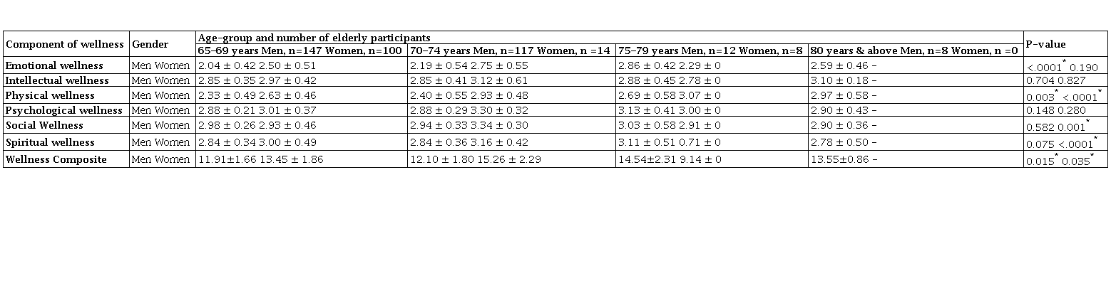Wellness composite score of elderly males (Table 4) were maximum in the75–79 year age-group with a mean of 14.54±2.31, and minimum score of 11.91±1.66 was recorded in the 65–69 year group. Wellness components like emotional wellness showed minimum mean scoresof 2.04±0.42 in 65-69 years age-group, and psychological wellness showed a maximum mean score of 3.13±0.41 in the 75–79 year age-group. Intellectual wellness and physical wellness components showed progressive increase in mean scores with advancing age. In elderly men, component of perceived wellness like intellectual, psychological, social and spiritual wellness’s showed no statistical significance, while emotional, physical and composite wellness score wellness had statistical significance with . < 0.05. Among elderly females (Table4), the 70–74 year age-group recorded a maximum mean score of 15.26±2.29 in the wellness composite score. Wellness components like social wellness showed maximum mean score of 3.34±0.30 in 70–74 years age group, whereas minimum mean values were recorded in spiritual wellness with a mean of 0.71±0 in 75–79 year group. Social wellness (3.34 ± 0.30), psychological wellness (3.30±0.32), spiritual wellness (3.16±0.42) and intellectual wellness (3.12±0.61) in 70–74 year showed maximum mean values for component of perceived wellness on comparisons to other age-groups. Among the elderly women participants, composite wellness score and component of perceived wellness like physical, social and spiritual wellness showed a statistical significance with . < 0.05, whereas emotional, intellectual, psychological wellness component had no significance statistically.
