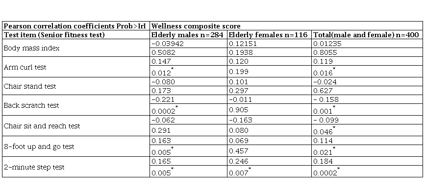 Materials and Methods: A community-based cross-sectional study was undertaken to assess the physical fitness and perceived wellness in 400 elderly (≥65 years) subjects. The Senior Fitness Test (SFT) for assessing functional/physical fitness and Perceived Wellness Survey (PWS) were used to assess their well-being. Bivariate correlation analysis was used for individual testsand multiple linear regressions were used to analyze relationship of wellness composite score with physical fitness test.