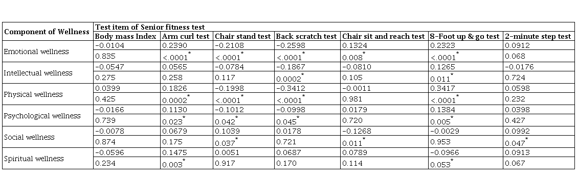 After analyzingthe association between the individual component of wellness and individual test of physical fitness it was found that emotional wellness had the strongest association with the entire physical fitness test except for BMI and aerobic endurance test. This finding suggests that the emotional wellness component is an important determinant or health protective factor in maintaining overall physical fitness. On further analysis, it was found that values of the components of wellness and physical fitness tests were strongly correlated and dependent on each other. Additionally, the findings of our study suggest that high wellness is a strong predictor for improved physical fitness among the elderly which may create an opportunity for primary geriatric care to develop subject-specific intervention for their successful ageing.