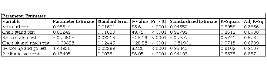 Statistical analyses were performed using the SAS (Statistical Analysis System) statistical package (version 9.0; SAS Institute, Inc., Cary, NC). The descriptive statistics are presented as means and standard deviations for continuous variables and as frequencies and percentages for categorical variables used for all measures. Inferential statistic was developed using analysis of variance (ANOVA). Bivariate correlation analysis for individual test of physical fitness and composite wellness score and between component of wellness and physical fitness test of elderly participants were also calculated. Multiple linear regressions were used to analyze the relationship of wellness composite score with physical fitness test of elderly study participants. The statistical significance was set at p< 0.05.