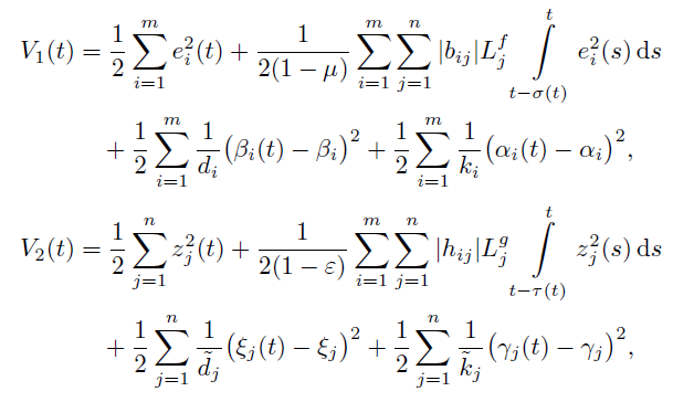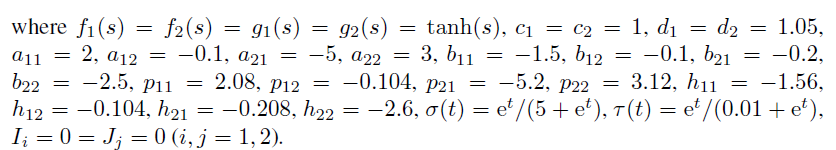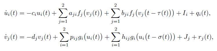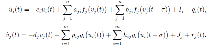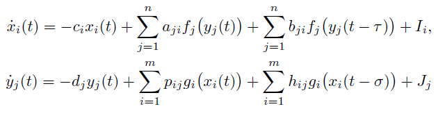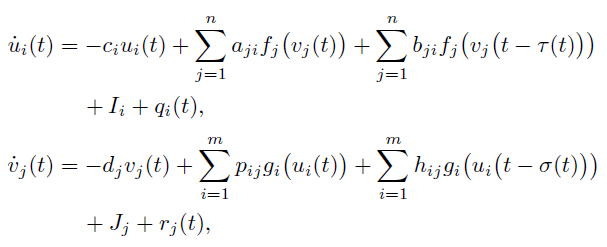 where xi(t) and yj(t) indicate the state variable of the neurons at time t, respectively; fj(.) and gi(.) are activation functions; τ (.) and σ(.) denote the time-varying delays, which satisfy 0 ≤ τ (.) ≤ τ and 0 ≤ σ(.) ≤ σ; ci, dj denote the self connection of the ith, the jth neurons; aji, bji, pij, and hij are connection weights; i= 1, 2, . . . , m and j= 1, 2, . . . , n} ; m ≥ 2 and n ≥ 2 are the number of units in NNs; Ii and Jj are the input of the ith and jth neurons.