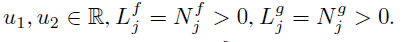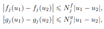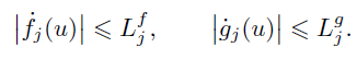 For all j ∈ J , u ∈ R, there exist positive constants Lf and Lg such that
