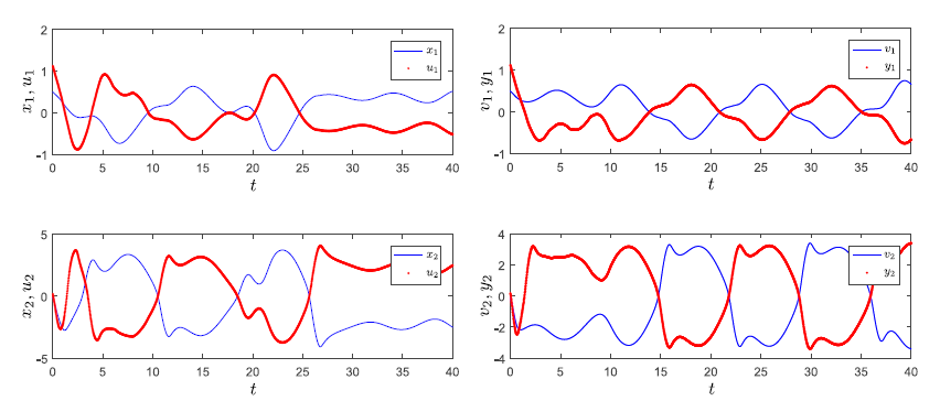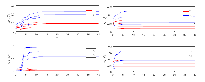 It can be easily checked that Assumptions 1 and 3 hold with Lf = Lf = 1, Lg = L2 = 1, ε = µ = 1. Moreover, from system (5) in Fig. 1 we can easy find that the solu- tions of system (5) are bounded and Assumption 3 holds. Consequently, based on Theo- rem 1, systems (5) and (6) are PS. When Pi = P˜j = 1, the estimation of synchronization errors are given in Fig. 2, and the state trajectories of drive-response systems are given in Fig. 3. In Fig. 4, the time evolution of the controllers gains βi, αi, γi, ξi is given. Figures 5 and 6 show the time estimations of synchronization curves and errors for p˜j = −1.