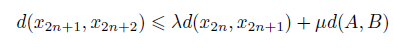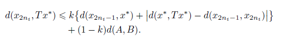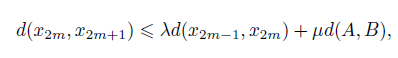 Now, we want to show that {x.} is a cyclically Cauchy sequence. For this, it is sufficient to show limn,m→∞ .(.2., x2.+1) = .(A, B). Let . ≥ .. Since (T, S) is a cyclic .-contraction pair, we have