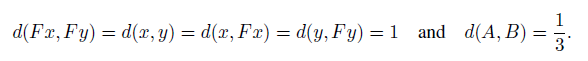 Example 2. Let . = R be endowed with usual metric d, A = [0, 1.3] and . = [2.3,1]. Then (A, B) is a proximally complete pair, and .(A, B) = 1.3. Now, we define a mapping . : A B A B as Fx = 1 . for all x A B. Then it is clear that . (.) . and . (.) ., hence, . is a cyclic mapping. Besides, we can see that inequality (4) holds for . = 1.2. Indeed, we have