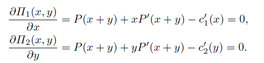 Assuming, we have two companies competing over the same customers [16] and striving to meet the demand with overall production of . = . + .. The market price is defined as . (.) = .(. + .), which is the inverse of the demand function. Cost functions are ..(.) and ..(.), respectively. Assuming that both companies are rational, the profit functions are ..(x, y) = xP (. + .) ..(.) and ..(x, y) = yP (. + .) ..(.). The goal of each player is maximizing profits, i.e. max ..(x, y): x, assuming that . is fixed and max ..(x, y): y, assuming that . is fixed . Provided that functions . and c., i = 1, 2, are differentiable, we get the equations