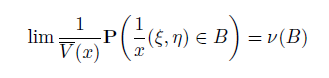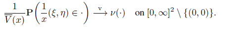 holds for every Borel set B C [0, ∞ ]2 that is away from (0, 0) and ν-continuous (i.e. its boundary ∂B has ν-measure 0). Related discussions on vague convergence can be found in [16, Sect. 3.3.5]. Necessarily, the reference distribution V ∈ R−α for some α > 0, for which case we write (ξ, η) ∈ BRV−α(ν, V ). By definition, for a random vector (ξ, η) ∈ BRV−α(ν, V ), its marginal distributions satisfy