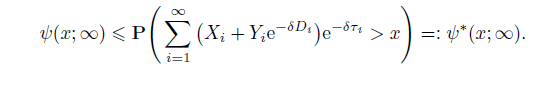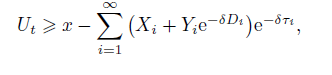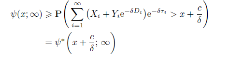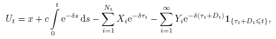 {Di; I ϵ N} be the delay times of the by-claims, which also form a sequence of i.i.d. nonnegative, but possibly degenerate at zero, random variables with common distribution H. Assume, as usual, that the three sequences {(Xi, Yi); i ϵ N} , {τi; i N} , and {Di; I ϵ N} are mutually independent. Denote by x > 0 the initial value of the insurer, by c ≥ 0 the constant premium rate, and by δ > 0 the constant interest rate. In this setting, the discounted surplus process of an insurer at time t ≥ 0 is