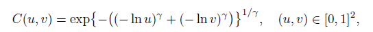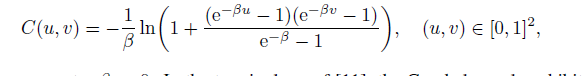 for some parameter β > 0. In the terminology of [11], the Gumbel copula exhibits the asymptotic dependence between two random variables, whereas the Frank copula shows the asymptotic independence. Hence, the former reflects a type of strong dependence, but the latter is relatively weak.