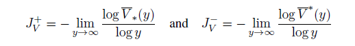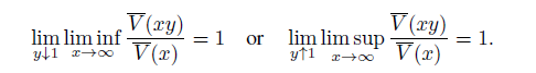 with V ∗(y) = lim inf V (xy)/V (x) and V ∗(y) = lim sup V (xy)/V (x). Clearly, if V ∈ C, then limy↓1 V ∗(y) = 1; and if V ∈ R−α for some α > 0, then J+ = J− = α.