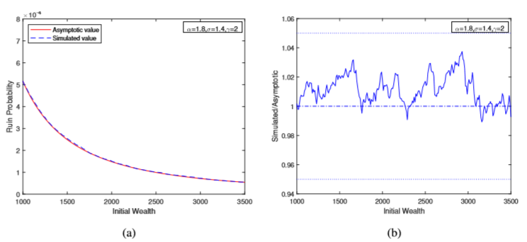In Fig. 1, we compare the CMC estimate ψˆ(x; T ) in (16) with the asymptotic value given by (4) on the left, and we show their ratio on the right. The CMC simulation is conducted with the sample size m = 5 106, the time step size T/n = 10−4 with n = 107, and the initial wealth x varying from 1000 to 3500. From Fig. 1(a) it can be seen that with the increase of the initial wealth x, both of the estimates decrease gradually and the two lines get closer. In Fig. 1(b), the ratios of the simulated and asymptotic values are close to 1. The fluctuation is due to the poor performance of the CMC method, which requires a sufficiently large sample size to meet the demands of high accuracy.
