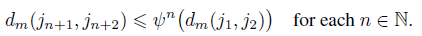 Continuing the proof after the above pattern, we get a sequence {jn} satisfying jn+1 ∈ Tjn, α(jn, jn+1) ≥ 1 and dm(jn+1, jn+2) < ψ(dm(jn, jn+1)) < dm(jn, jn+1) for n ∈ N. Having in mind the monotone behavior of ψ and inequality (6), we are led to