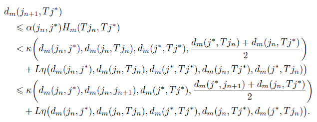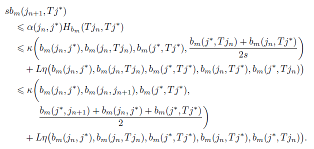 Continuing the above pattern, we get a sequence {jn} endowed with the properties jn+1 ∈ Tjn and α(jn, jn+1) ≥ s, bm(jn+1, jn+2) < bm(jn, jn+1) and