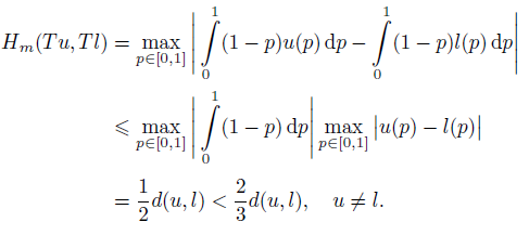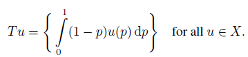 Example 2. Let X = C[0, 1] be the collection of all continuous functions from [0, 1] into R with the metric d(u, l) = maxp∈[0,1] |u(p) − l(p)|. Define an operator T as