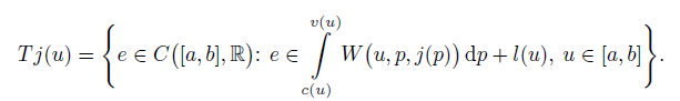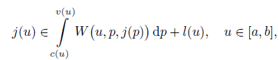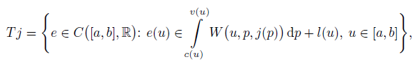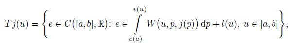 (15)where l, c, v : [a, b] → R are continuous functions, c(u) ≤ v(u) for all u ϵ [a, b], and W : [a, b] x [a, b] x R → Pcv(R), Pcv(R) is a collection of nonempty, convex and compact subsets of R such that W ( ., ., j) is a lower semicontinuous operator for each j ϵ C([a, b], R), where C([a, b], R) represents the space of all continuous functions from [a, b] into R.
