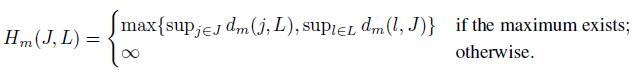 Consider (X, dm) a metric space and CL(X) the collection of all nonempty closed subsets of X. For J ∈ CL(X) and l ∈ X, dm(l, J) = inf{dm(l, j), j ∈ J}. For each J, L ∈ CL(X), let