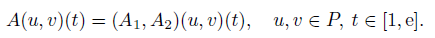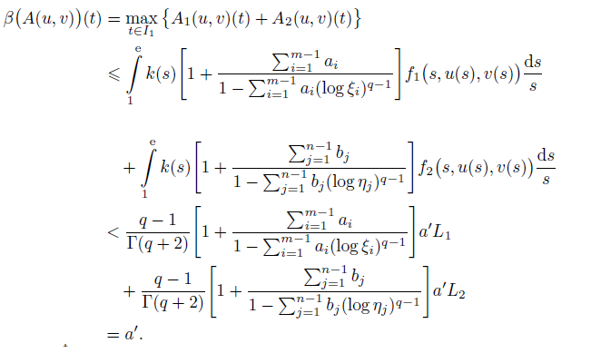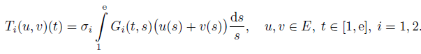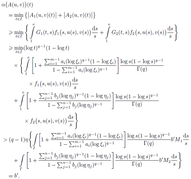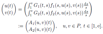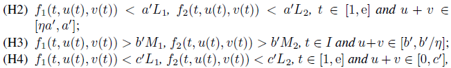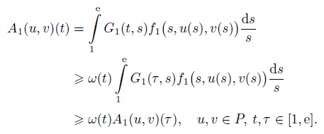 Let . := .[1,e], ǁ.ǁ = max.∈[1,e] |.(.)|, and . := {. ∈ .: .(.) ≥ 0 ∀. ∈ [1, e]}. Then (E, ǁ·ǁ) becomes a real Banach space, and . is a cone on .. Moreover, . × . is a Banach space with the norm ǁ(u, v)ǁ = ǁ.ǁ + ǁ.ǁ, and . × . is a cone on . × .. Let