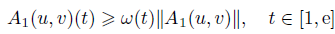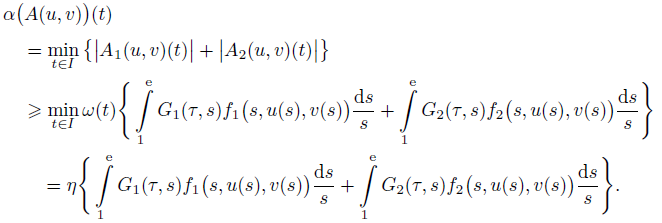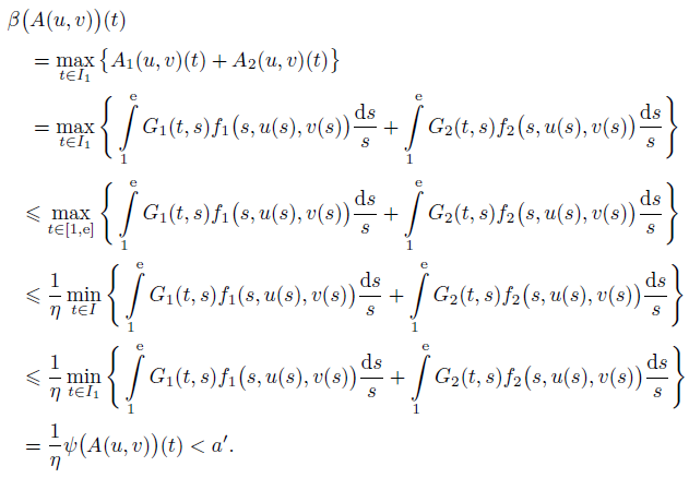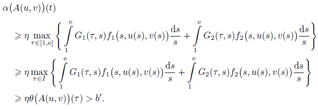 Finally, we prove that (B4) holds. Let (u, v) ∈ .(γ, β, a., c.) with .(.(u, v))(.) < ηa.. Note that min... G..t, s) ≥ ηG..τ, s) for τ, s ∈ [1, e], and thus min... G..t, s) ≥ . max.∈[1,e]G..τ, s) for . ∈ [1, e], . = 1, 2. Therefore, we have