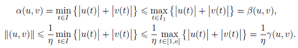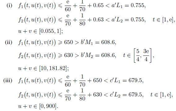 Therefore, if (u, v) .(γ, θ, α, b., b./η, c.), then .. ≤ .(.) + .(.) ≤ ../η for t I; if (u, v) .(γ, β, ψ, ηa., a., c.), then ηa. ≤ .(.) + .(.) ≤ .. for t I.. As a result, (H3) enables us to find