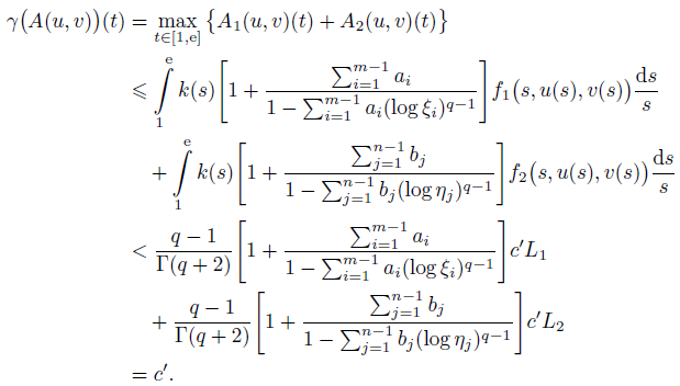 where I. is the Hadamard fractional integral with γ > 0. By using Leray–Schauder’s alternative and Banach’s contraction principle the authors obtained the existence and uniqueness of solutions, respectively. In [11], Jiang et al. adopted the fixed point index to study the existence of positive solutions for the system of nonlinear Hadamard fractional differential equations involving coupled integral boundary conditions