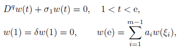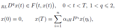 where 1 < q ≤ 2, RLD. is the Riemann–Liouville fractional derivative, .I.i is the Hadamard fractional integral, η. ∈ (0, T ) with Σn α.η.−1.(. − 1).i /= T.−1. In [29], Zhang et al. utilized the Guo–Krasnosel’skii fixed point theorem to obtain the multiple positive solutions for the Hadamard fractional integral boundary value problems