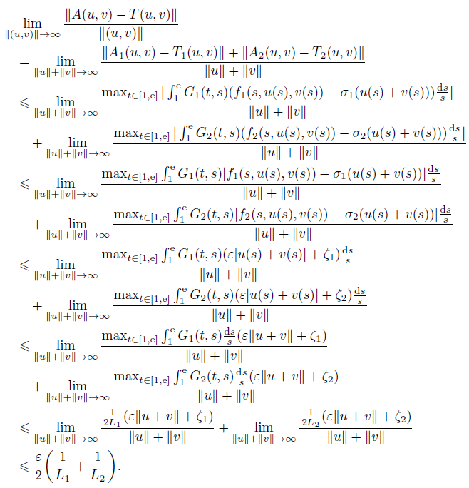 For the arbitrariness of ., we have limǁ(u,v)ǁ→∞ .(u, v) .(u, v) . (u, v) = 0. Note from (H6) that . = (0,0) is not a fixed point of .. Hence, from Lemma 6 we have that . has a fixed point in ., and this fixed point is nontrivial, i.e., (1) has at least one nontrivial solution. This completes the proof.