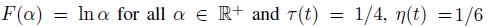 Let us choose F(a) = ln a for all a ∈ R+ and T (t) = 1/8, n(t) = 1.10 for all t ∈ (0, ∞). Then it is obvious that F ∈