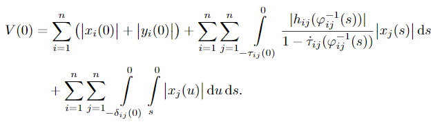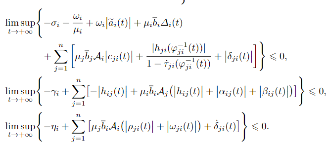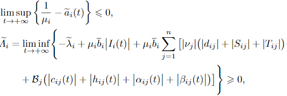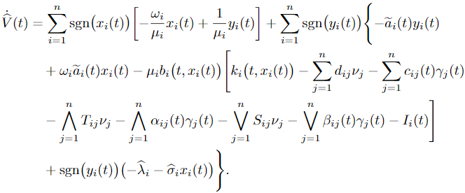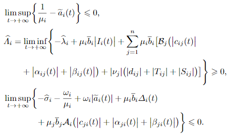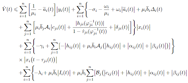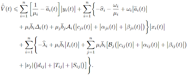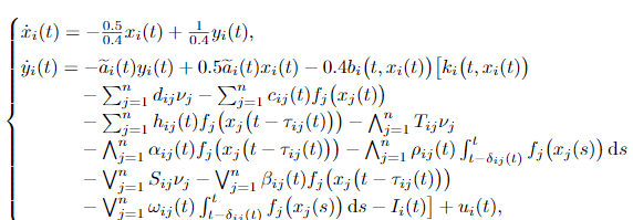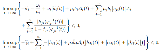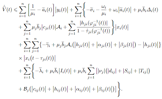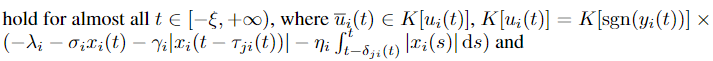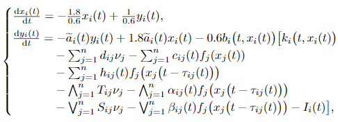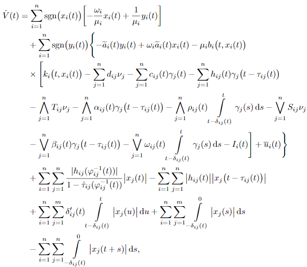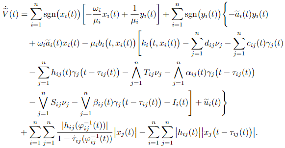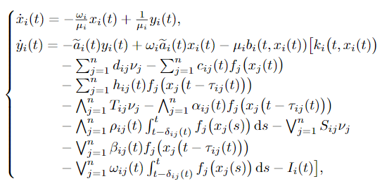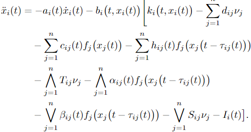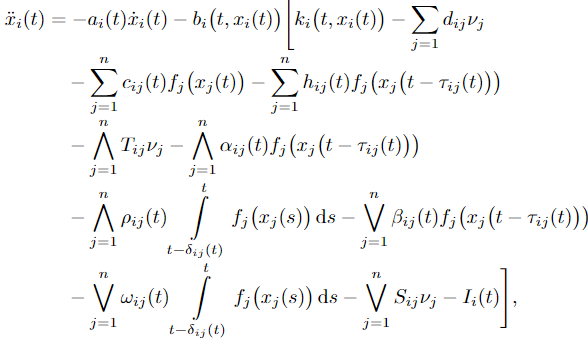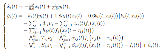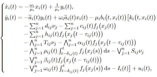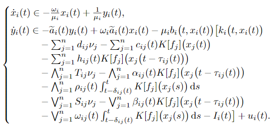 Remark 1. The proposed neural system includes the inertial items, fuzzy logics, CG terms, discontinuous activations and discrete and distributed time-varying delays. Thus, the presented results are obtained in a more general framework and are more practical than the aforementioned previous results cited in the references such as [8, 13, 14, 24].