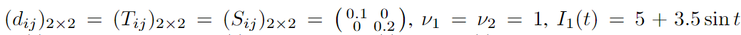 Example 1 [Example used to verify Theorem 1]. Consider the following two-dimensional DFICGNN with discrete and distributed time-delays: