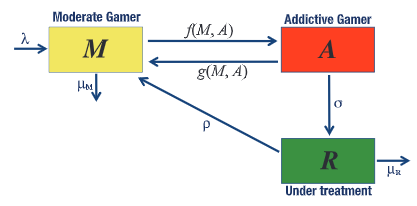 are, respectively, the population sizes of moderate gamer, addictive gamer, and gamer under treatment at time t. Parameters λ, µM, ρ, σ, and µR are positive constants, while f (M, A) and g(M, A) are functions of M and A. The parameter λ gives the recruitment flux of new internet gamers. In this modeling, we assume it a positive constant independent of the gamer population, although it could be related to the population size of gamer or internet user. The parameters µM and µR are the rate of stopping gaming for moderate gamer and that for the gamer under treatment about the addiction. The parameter ρ is the rate of relapsing into gaming after the treatment. For a simplicity, in this preliminary work, we assume that such a relapsing gamer could be categorized in the moderate gamer, even though such a gamer would relapse into the addiction easier than the moderate gamer. The parameter σ is the rate of identifying the addiction and beginning the treatment. We can regard the value of σ as indicating a result derived from the amount of effort (e.g., budget and human power) and the effectiveness of the treatment operation.