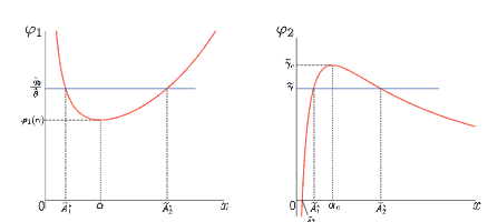 To consider the number of positive equilibrium states for (8), let us consider how many different extrema the function