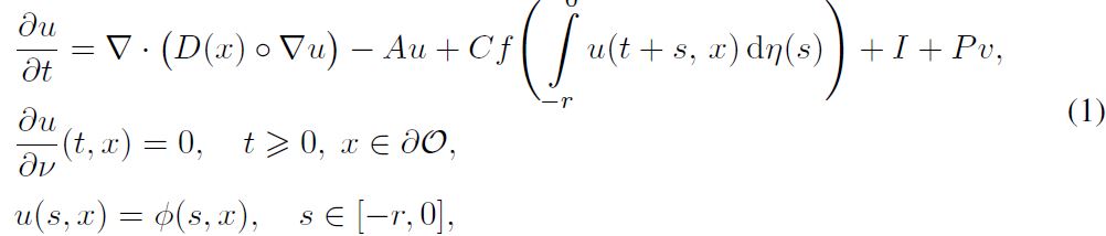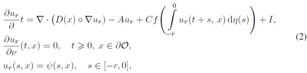 On the other hand, diffusion phenomenon is also neglected in the original model of HNNs. Actually, diffusion effect cannot be ignored in NNs when electrons move in an in- homogeneous electromagnetic field [14,16]. Reaction–diffusion Hopfield neural networks (RDHNNs) not only have theoretical influence, but also have been used in numerous fron- tier regions such as image encription [32], pattern formation [40]. Compared with original HNNs, RDHNNs are described through partial differential equations with initial and boundary conditions. It not only involves the time variable, but also the space variables.