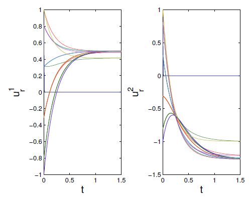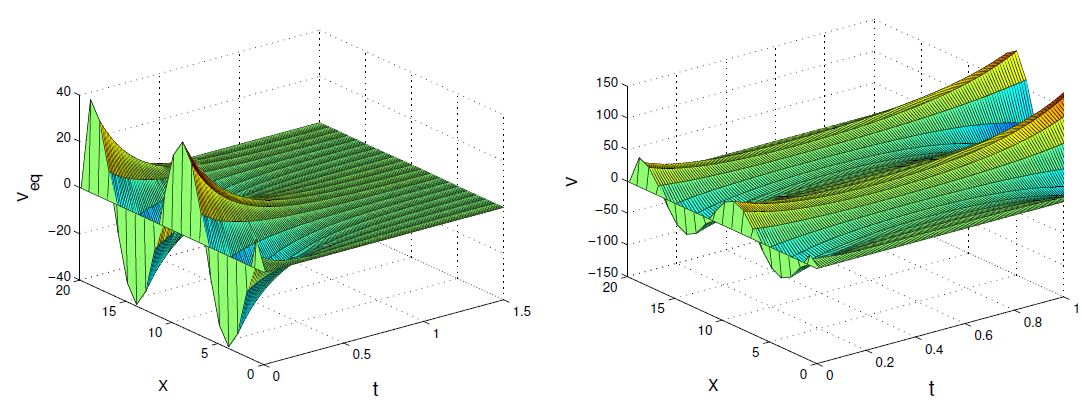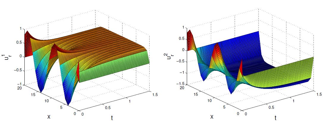 The simulation is carried out through Matlab. The code is based on the finite difference method. Specifically, the second-order centered difference scheme is utilized to discrete the space. The Runge–Kutta–Chebyshev method is used to discrete the time. We use this scheme to simulate the dynamical behavior of uncontrolled part of drive system. For detailed information, please see Figs. 1–2. From Fig. 1 the surface of response system is very complicated, especially, it seems that there is no equilibrium for