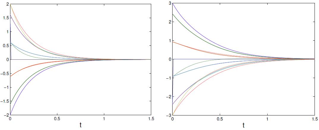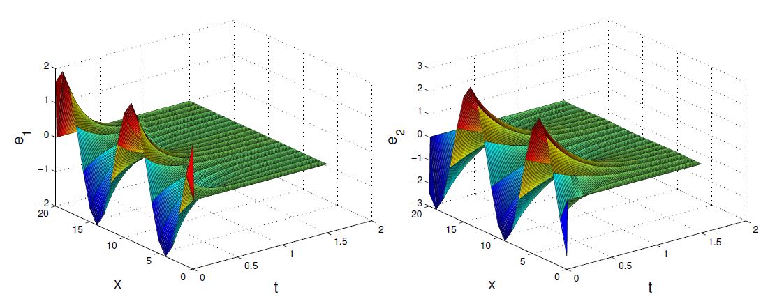 Figure 3 presents the asymptotic behavior for error system. The reason why we choose 3-D plot is that it is visual and intuitive. We can check the evolution of the system not only from the time span, but also from the space span. We can see that as time