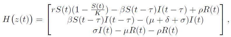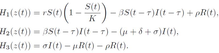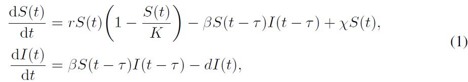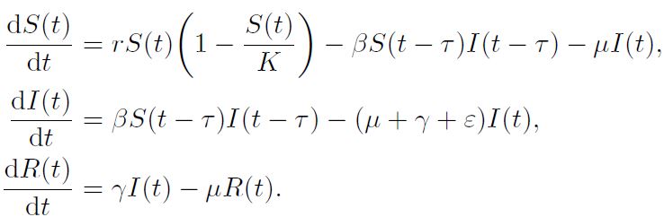 Taking into account the latent period of the disease (time delay) and logistic growth of the susceptibles, we can present the following SIRS epidemic model: