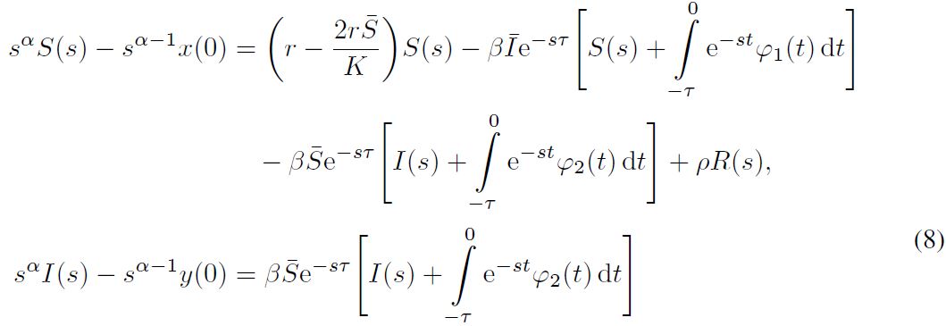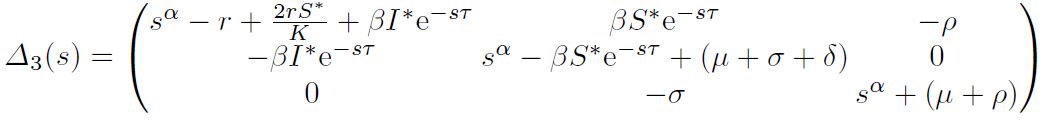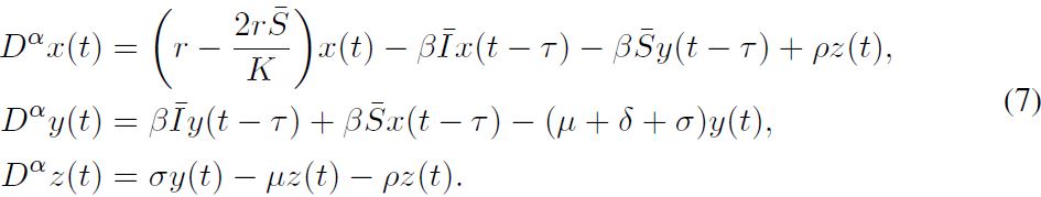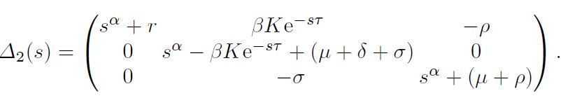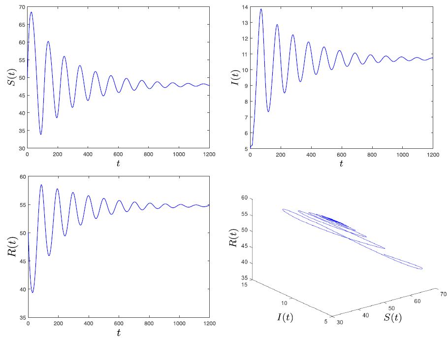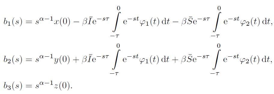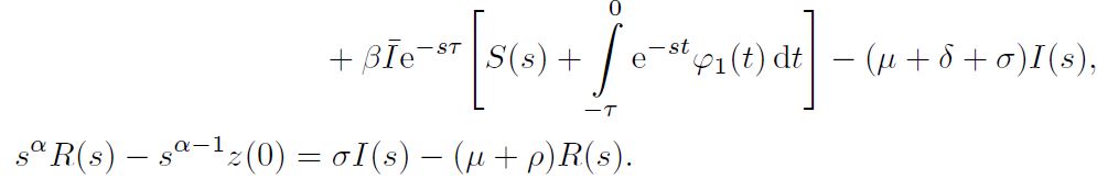 However, the above fractional-order system does not take into account the influence of the latent period of the disease, i.e., time delay. In fact, it takes a certain time for an infected person to show symptoms from being infected, so it is of great significance to discuss the influence of time-delay factors.